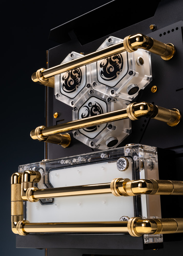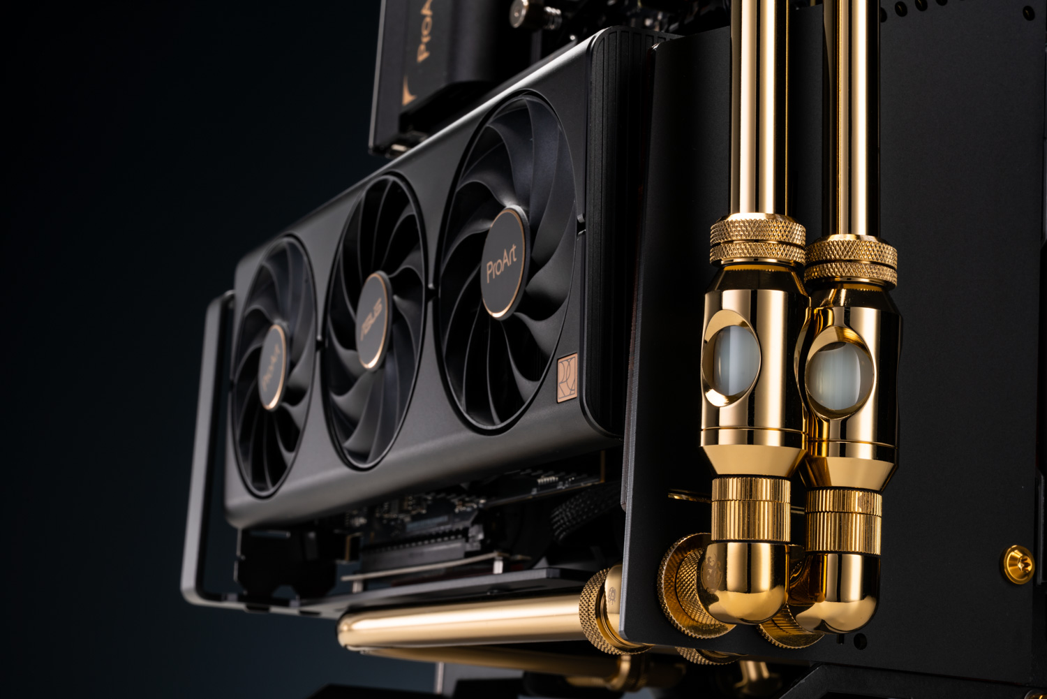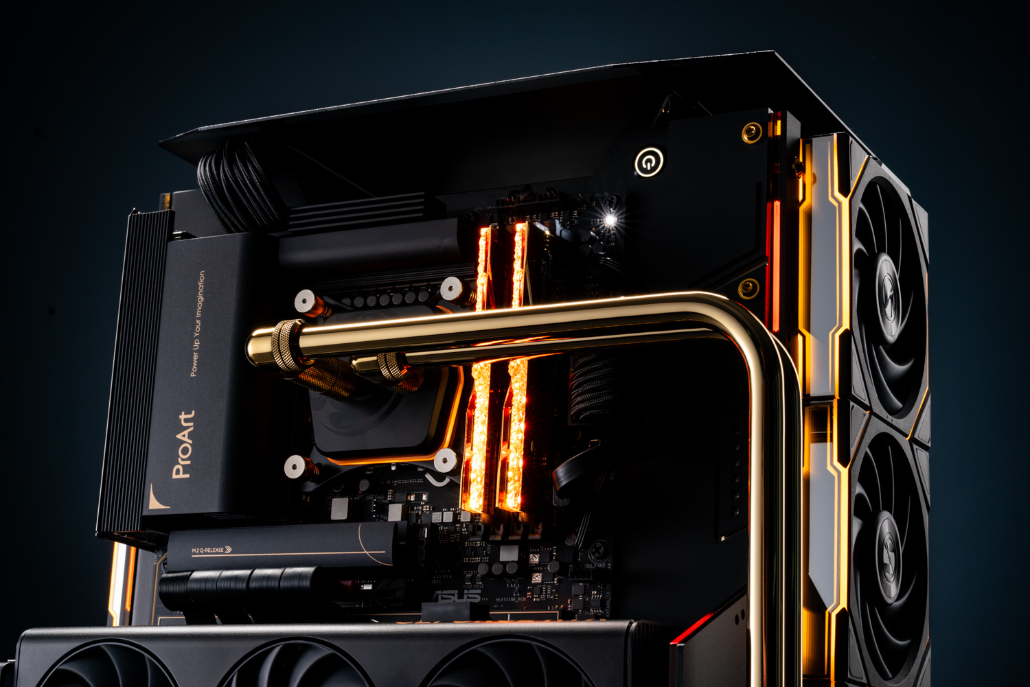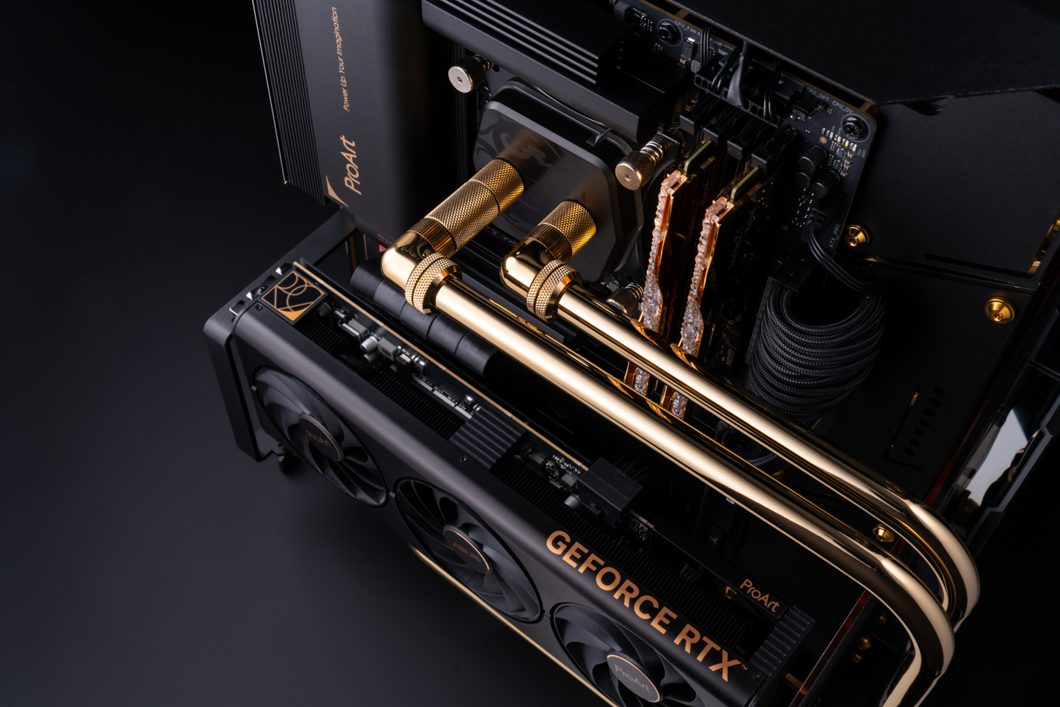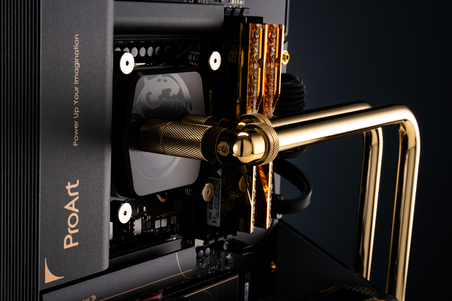 To keep the CPU running cool and look good doing it, Project Waterforce features a full Bitspower liquid cooling loop. The gold fittings and tubing are an excellent pairing with the ProArt aesthetic. Admittedly, many of the items used in the build are no longer available from us, but Bitspower has newer items now available including these water blocks.